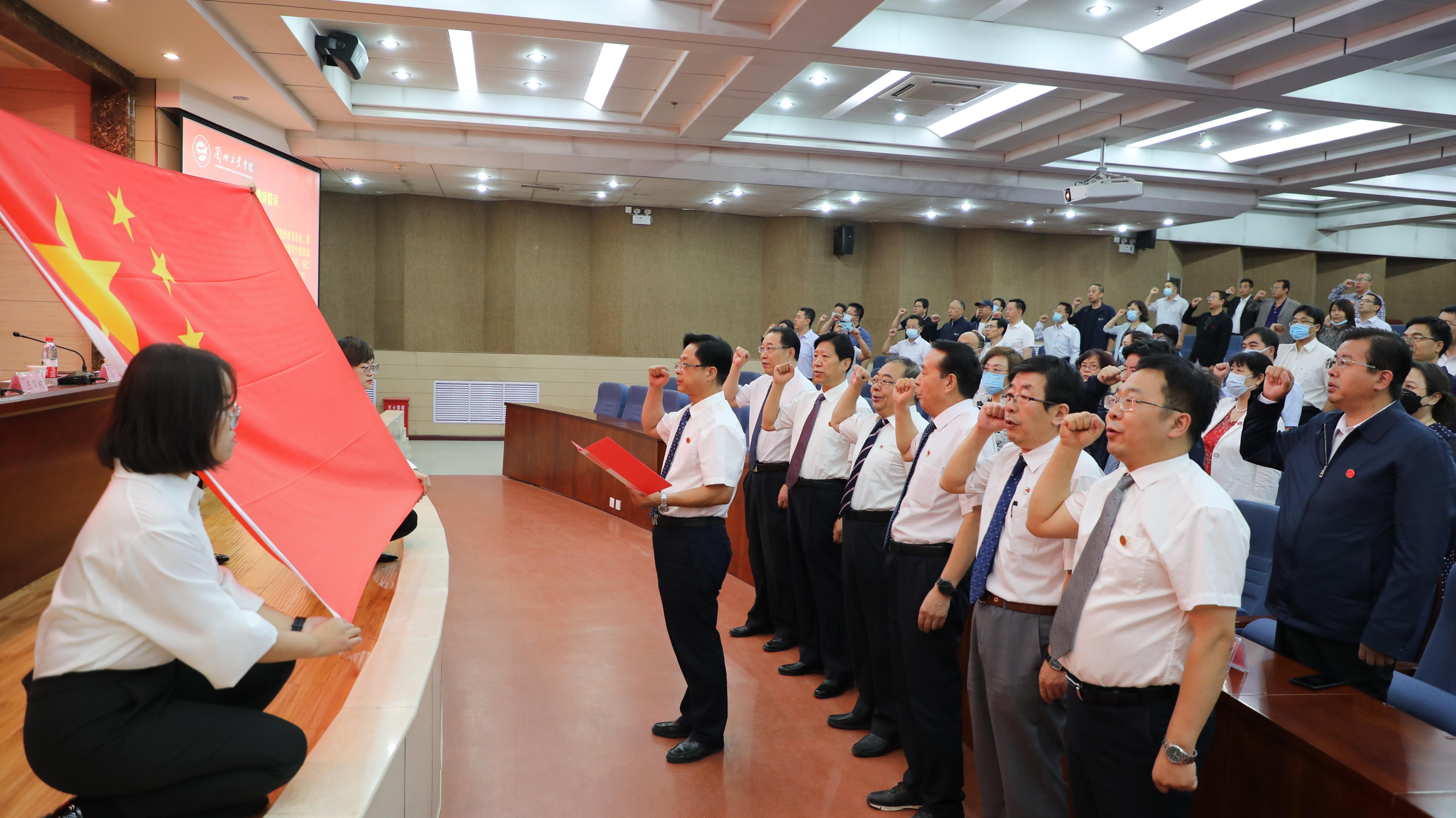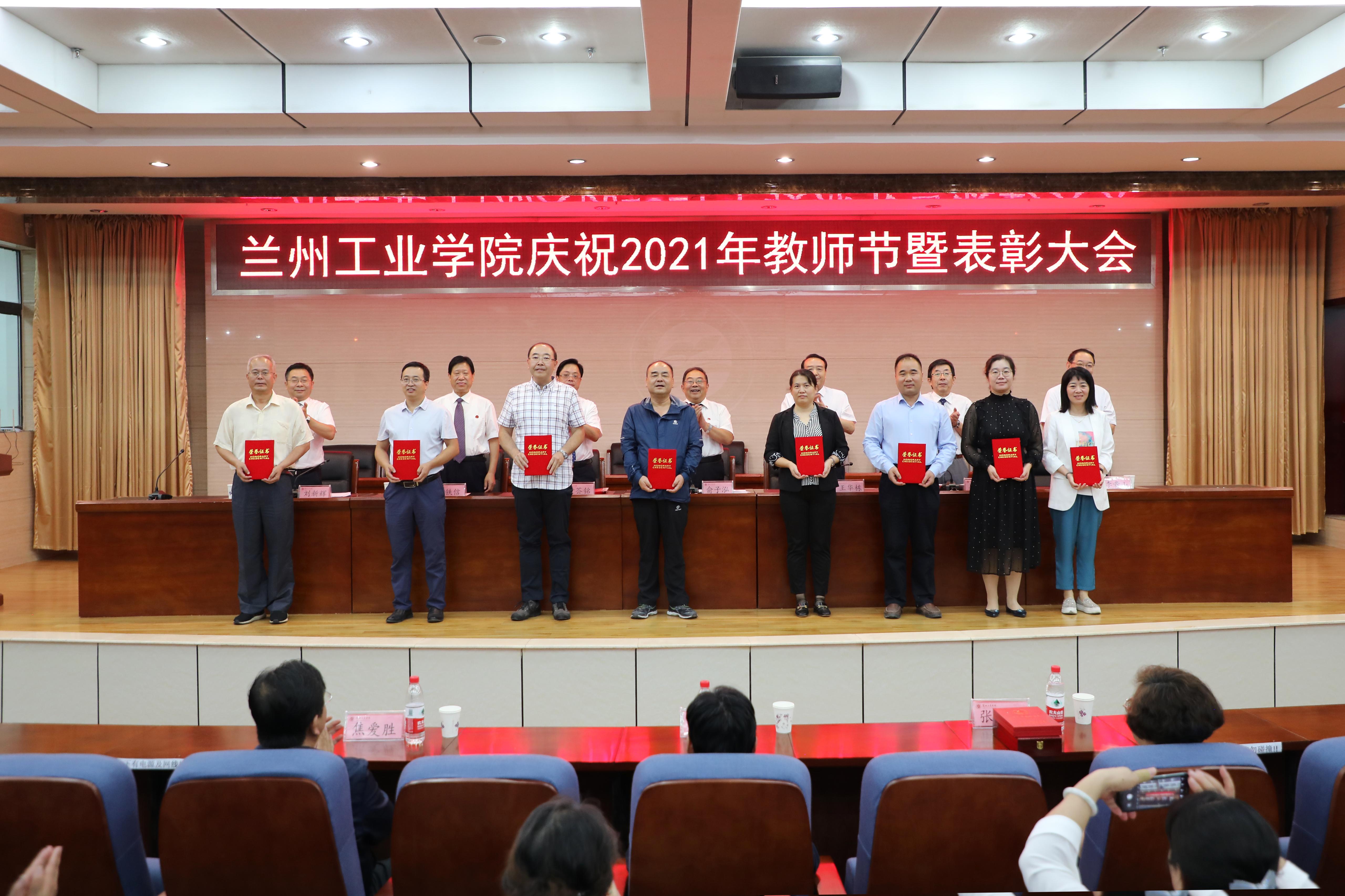 大会在雄壮的国歌声中拉开序幕。黄荟铭带领全体教师,面对国旗重温《人民教师誓词》。副校长马江宣读了《关于对为人民教育事业服务逾三十年教师颁发证章的决定》;副校长马铁信宣读了学校《关于表彰2021年“师德标兵”的决定》;副校长李贵山宣读了学校《关于表彰2021届优秀本科毕业设计(论文)的决定》《关于表彰2020-2021学年教学奖励项目的决定》;副校长刘新辉宣读了《关于公布兰州工业学院2020年“课程思政”示范课的通知》《关于表彰2020-2021学年创新创业竞赛优秀团队的决定》。教师代表、创新创业学院李祥林教授,学生代表、电气工程学院自动化18-4班潘宏远同学做了发言。