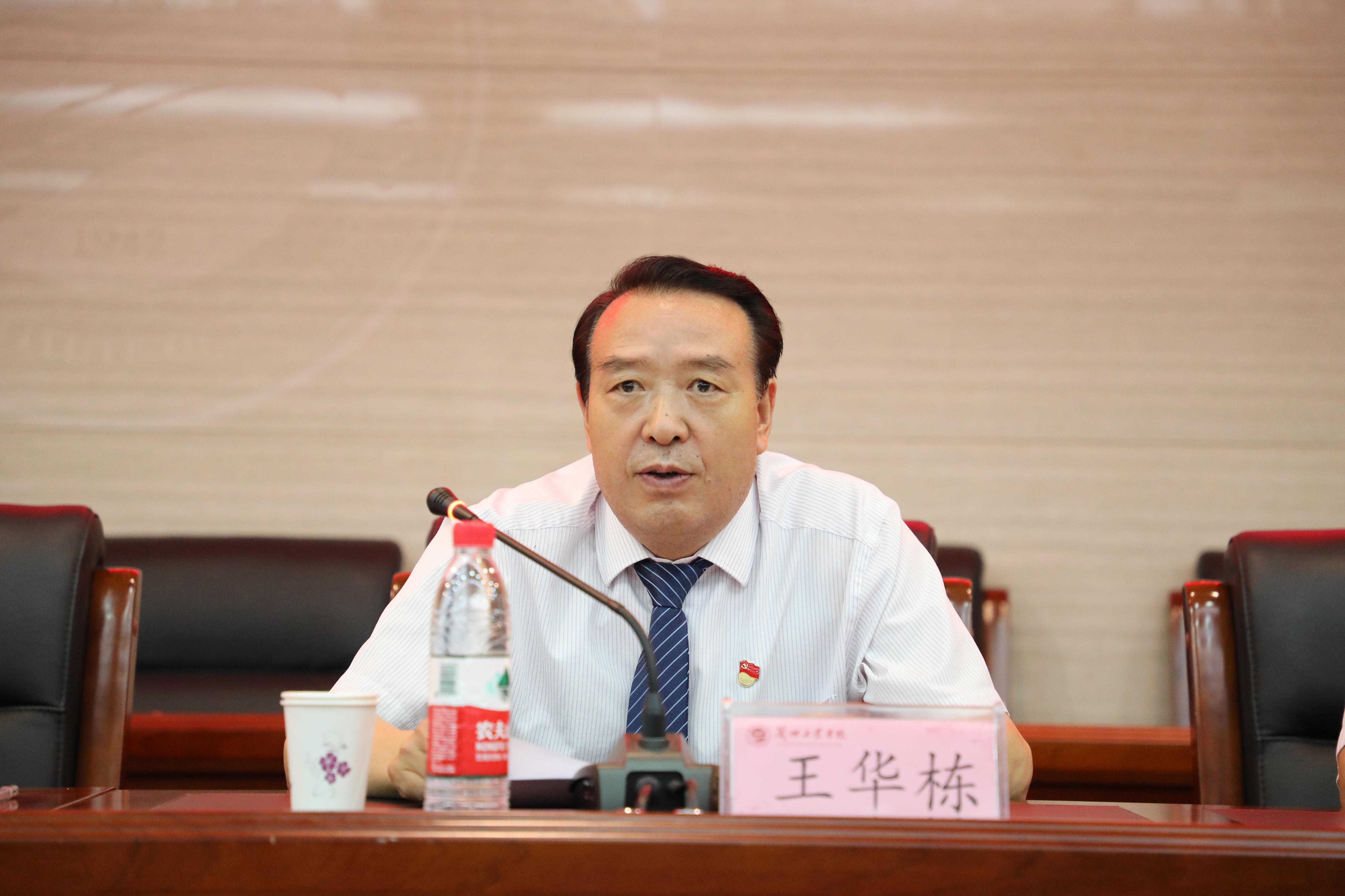 王华栋在讲话中代表学校向全体教师致以节日的问候和良好的祝愿!向受到表彰的先进集体和先进个人表示热烈的祝贺!向为学校建设与发展给予关心支持、做出积极贡献的全体离退休老教师、老同志表示崇高的敬意和亲切的慰问!他指出,今年是中国共产党成立100周年,是实现第二个百年奋斗目标和“十四五”的开局之年。一年来,全体教师坚守育人初心,勇担时代使命,在各自的工作岗位上恪尽职守,在教书育人的阵地上辛勤耕耘,在科学研究的征途上奋力探索,用自己的心血和汗水、学识与智慧,为学校的建设和发展做出了突出贡献。特别是在去年迎接教育部本科教学工作合格评估的过程中,面对繁重的迎评任务,全体师生员工以大局为重,加班加点、任劳任怨、无私奉献、忘我工作,出色完成了迎评促建各项任务,顺利实现了教育部提出的“办学条件基本达标、教学管理基本规范、教学质量基本保证”的“三个基本”要求。为此,教育部评估专家组给予学校“领导班子可敬、教职员工可亲、广大学生可爱”的良好评价。面对新冠肺炎疫情,全体教师积极投入线上教学,创新教学模式,拓展教学方法,充分利用各类网络平台开展线上教学,探索出线上教育教学的宝贵经验和方法,展现了疫情之下的担当与坚守,彰显了老师们的烛光精神与高尚情怀。