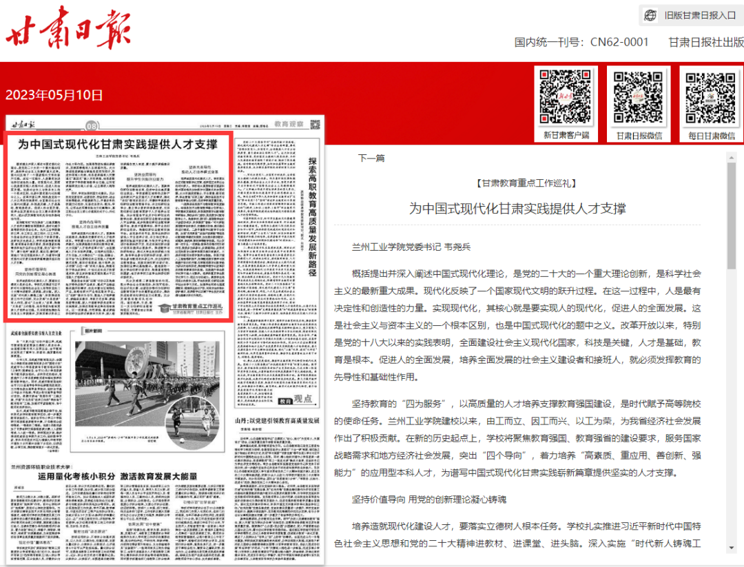2023年5月10日,《甘肃日报》刊发兰州工业学院党委书记韦尧兵《为中国式现代化甘肃实践提供人才支撑》的署名文章,介绍兰州工业学院突出“四个导向”,聚焦教育强国、教育强省的建设要求,服务国家战略和地方经济社会发展,着力培养“高素质、重应用、善创新、强能力”的应用型本科人才,为谱写中国式现代化甘肃实践崭新篇章提供坚实的人才支撑。