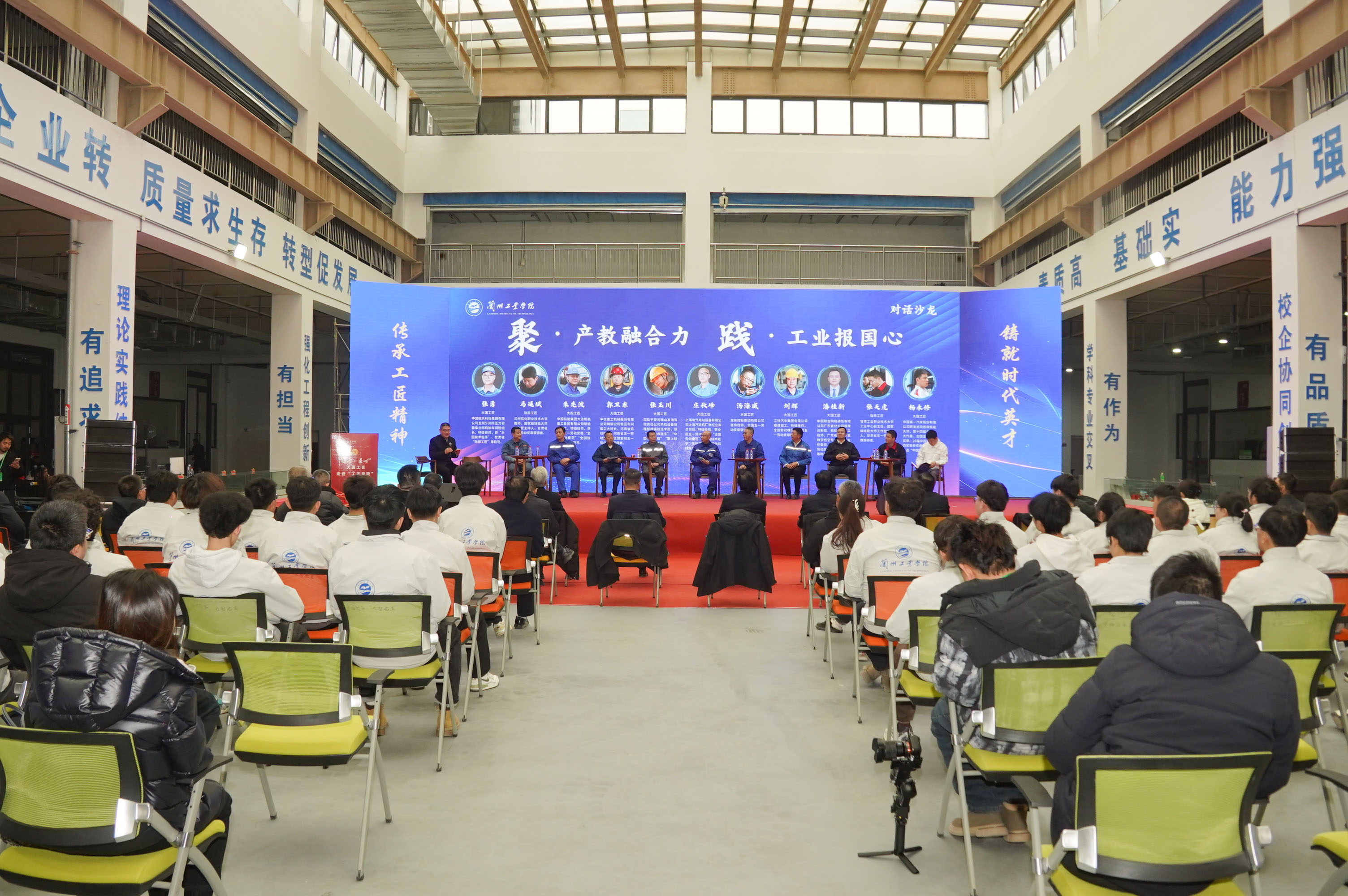 1月25日下午,兰州工业学院兰州新区校区彩旗列道,匠星闪烁。由甘肃省总工会主办、兰州工业学院承办、兰州工业学院产业学院协办的“大国工匠走进工匠学院”专场活动在这里隆重举行。此次活动是全国总工会、中央广播电视总台“大国工匠年度人物”宣传活动和“大国工匠助企甘肃行”的分支活动。全国总工会副主席(兼职)、大国工匠高凤林出席并发表讲话。大国工匠朱先波、杨永修、庄秋峰、刘辉、汤海威、潘桂新、张玉川、郭卫东、张勇,陇原工匠马延斌、张天虎出席并与青年学子面对面进行对谈交流。省总工会党组成员、副主席李永军,学校党委书记白江平,党委副书记、校长刘新辉及学校领导班子其他成员出席活动。
