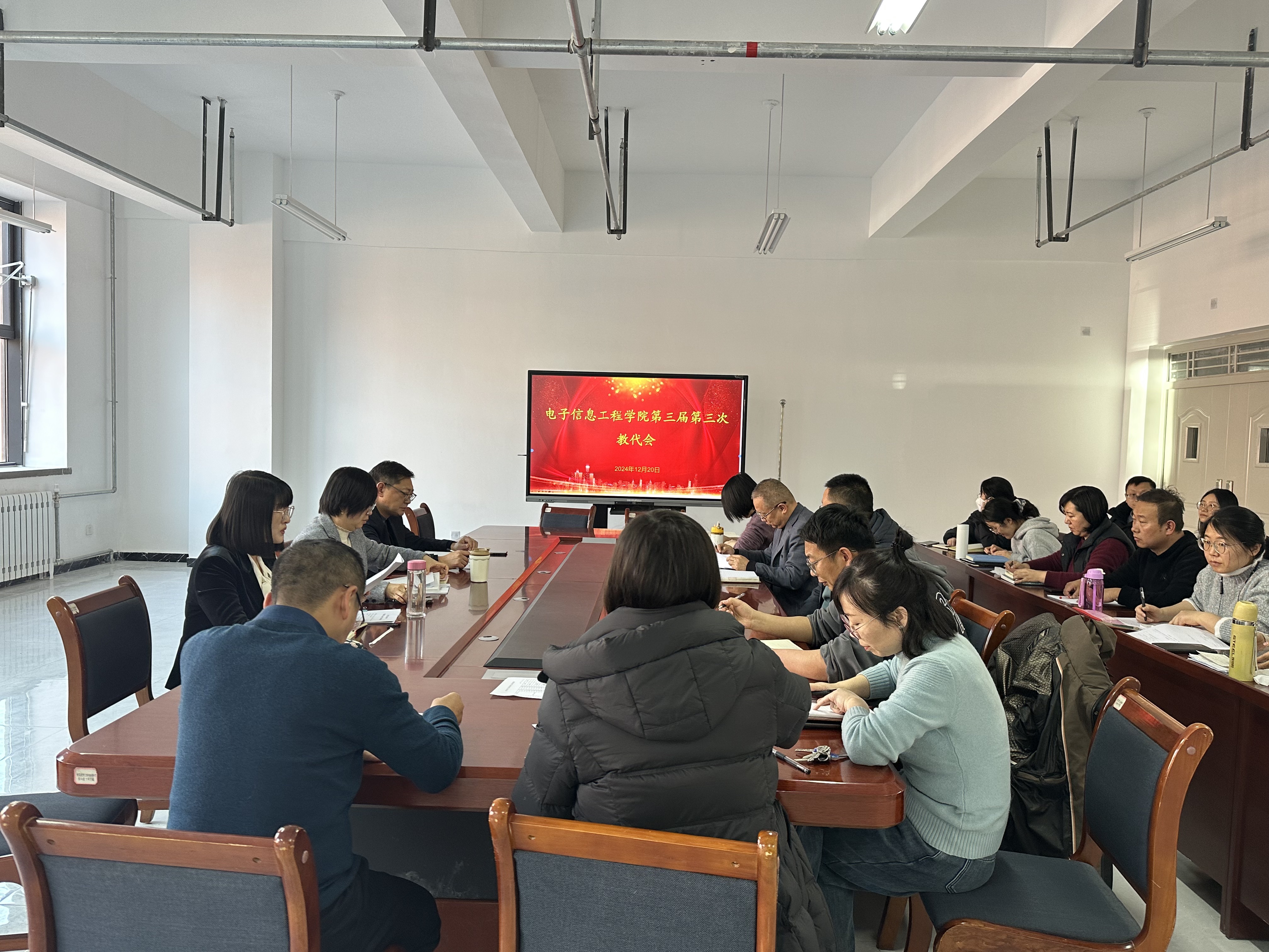 12月20日,电子信息工程学院在学院会议室召开第三届教职工大会第三次会议。会议由学院党委副书记彭琳茹主持,全体教职工参加,企业方教师列席了会议。