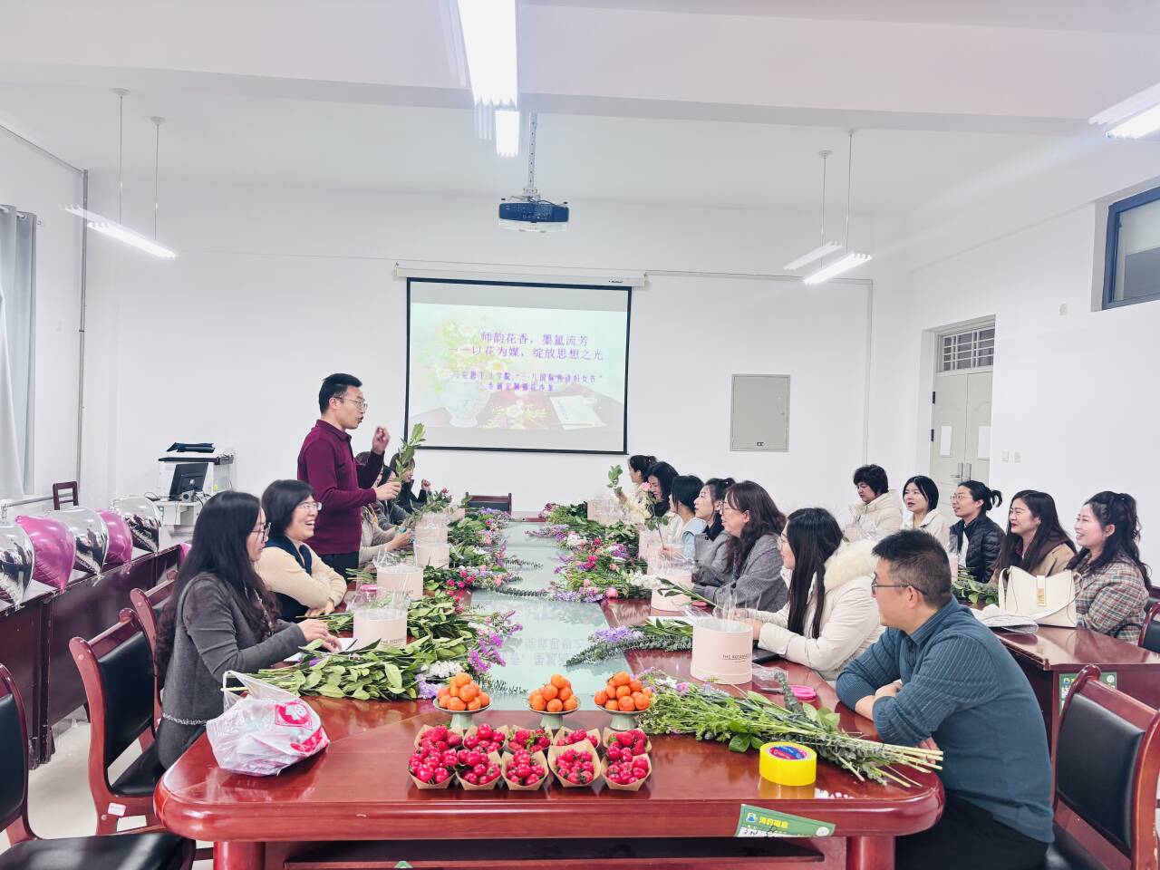 随后,“花语传情,思想绽放”主题分享会正式开始。每位女教职工都提前准备了与“花”或“思想”相关的主题分享内容,形式丰富多样,分享自己对某种花的感悟,或讲述花与思想的结合,或分享工作中的思想火花,现场气氛热烈,思想的火花不断碰撞。分享结束后,大家积极交流讨论,分享彼此的感受和启发,促进了思想的交流与融合。