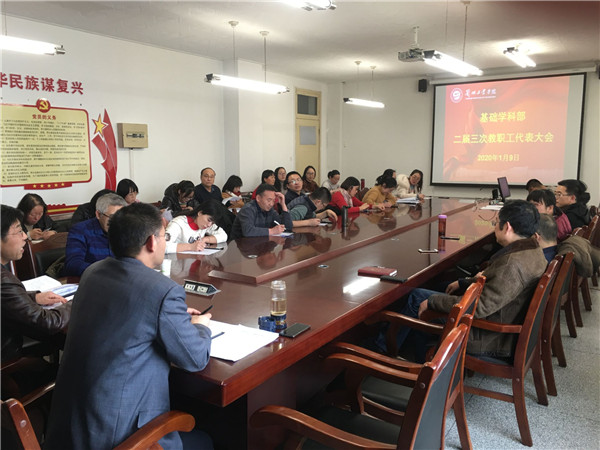 2020年1月9日,基础学科部召开第二届教职工大会第三次会议。党总支书记沈文国主持会议,部门全体教师参加了会议。 会上,沈文国致开幕词。部门主任祁忠斌作了《基础学科部2019年工作报告》和《基础学科部2019年资金使用情况报告》。与会教职工就两个报告进行了讨论,并对部门今后发展提出了宝贵的意见和建议。会议总结了基础学科部一年来取得的成绩和不足,确定了今后一个时期基础学科部的重点工作。 在完成各项议程后,沈文国作了大会总结,并宣布大会胜利闭幕。